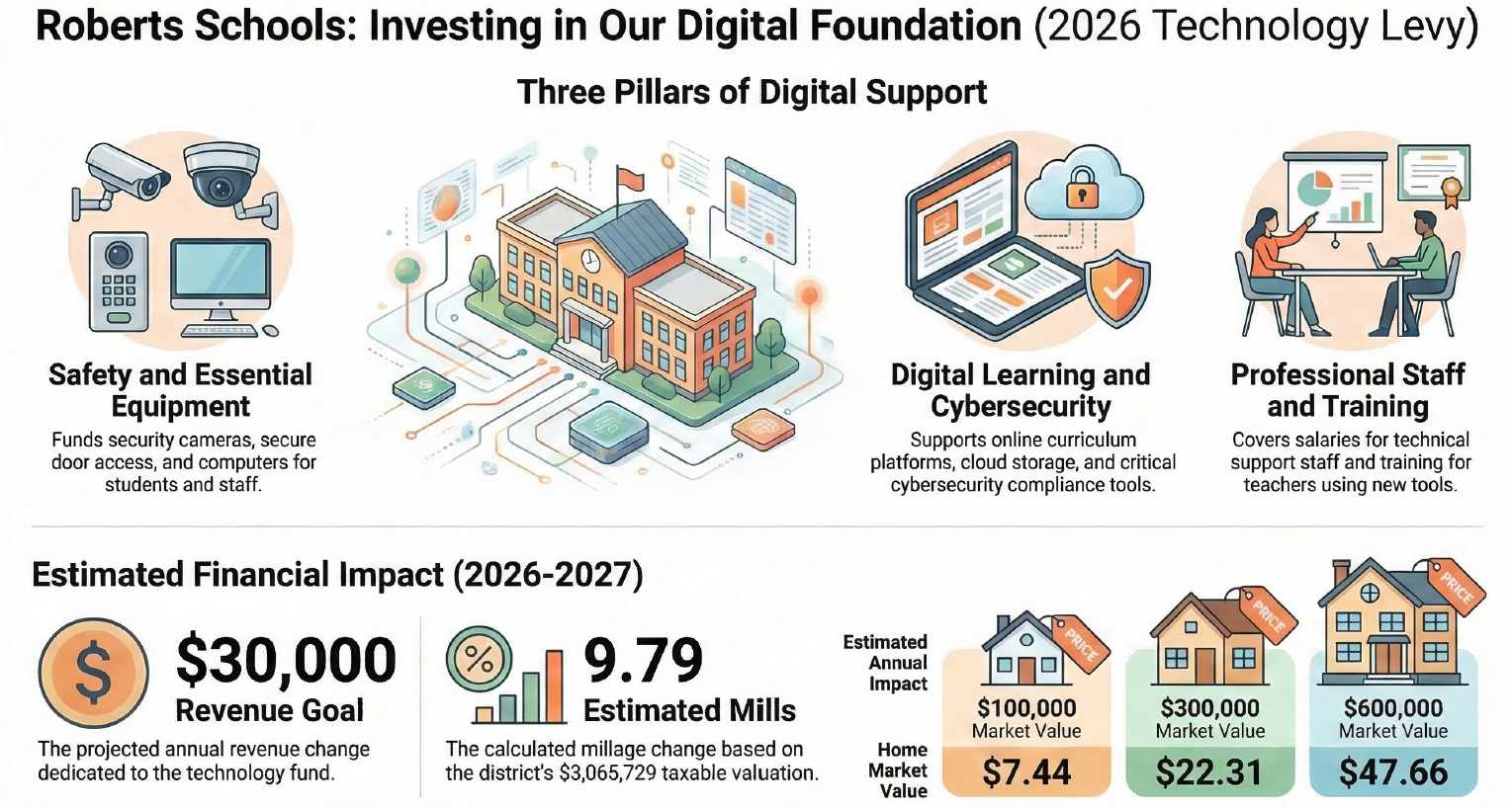 Roberts Public School provides a challenging, protective and rewarding educational experience for kindergarten through the twelfth grade students. Utilizing a low student-to-educator ratio, one-to-one computing, a statewide offering of courses and strong community support, our school is dedicated to propel each of our Rockets in their academic and life endeavors.